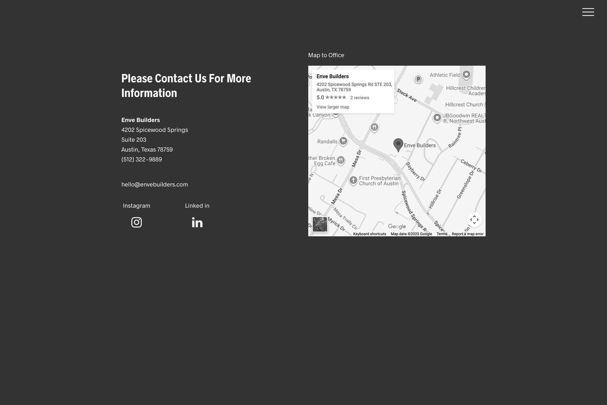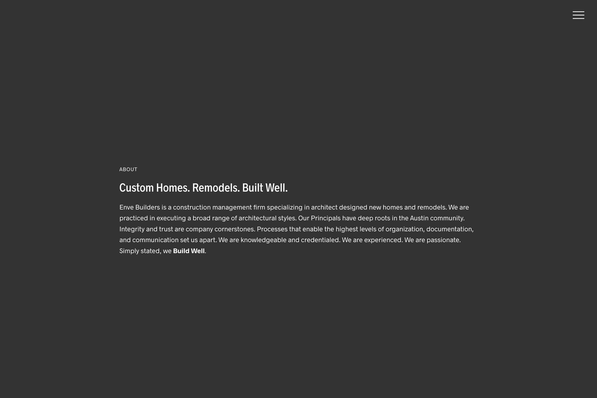 Austin Web and Design partnered with Enve Builders, an Austin-based luxury home builder, to redesign their website with a modern, high-end look that reflects the quality of their custom homes and large-scale remodels. The new site focuses on immersive imagery, smooth navigation, and easy content management so the client can keep their portfolio up to date.