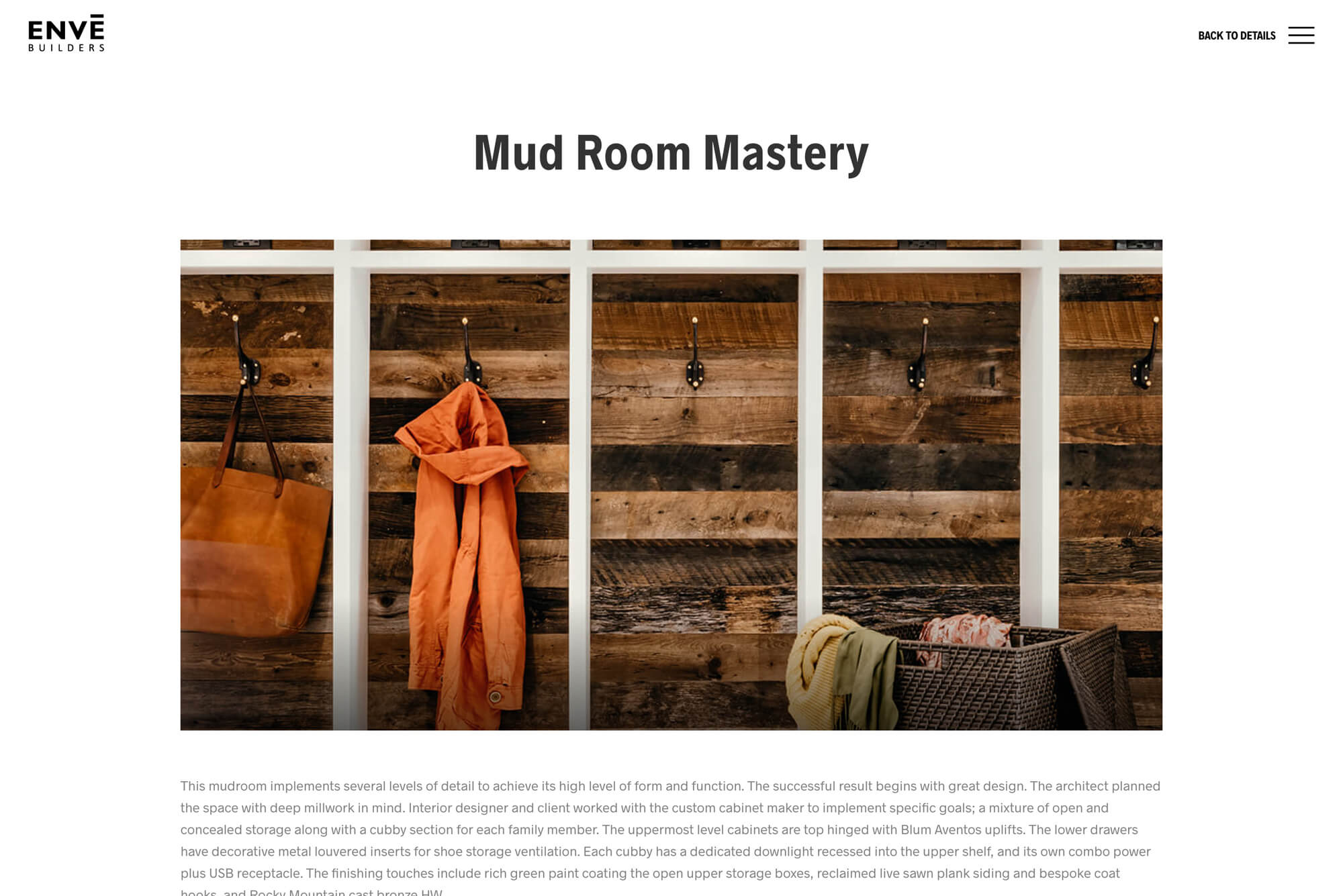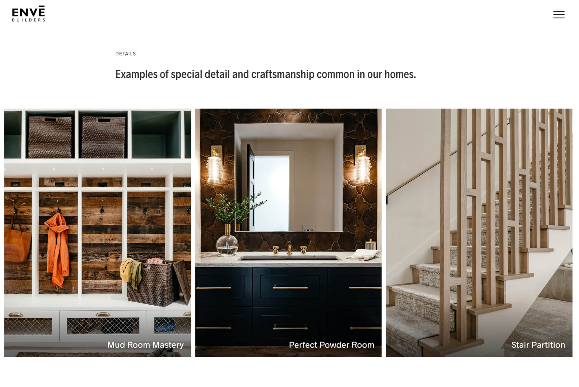 The redesigned Enve Builders website features a custom project slider on the homepage to highlight their new construction and remodeled homes. Large, full-width images, smooth transitions, and clear captions help visitors quickly understand the builder’s style, craftsmanship, and attention to detail.